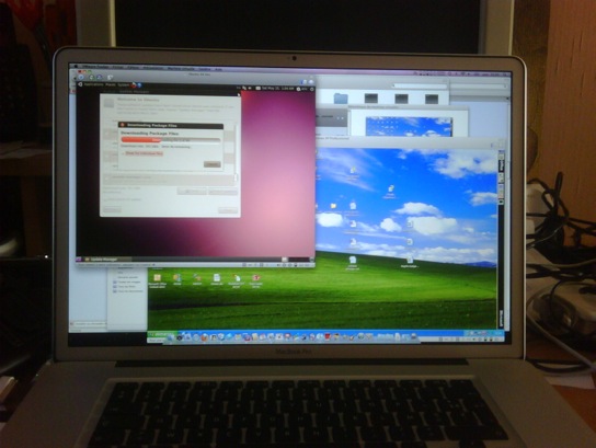 Et voici un bref aperçu des possibilités de ce Mac avec VmWare Fusion, Ubuntu 64 bit cohabite avec Windows XP sans problème. Seul regret, ne pas avoir pris l’option 8 Go mais Apple a mis vraiment la barre trop haute au niveau des tarifs. Maintenant je dois m’habituer avec le nouveau touchpad maison d’Apple, cela va me changer du MacBook de ma fille (Core2 Duo 2,16 Ghz carte GMA)